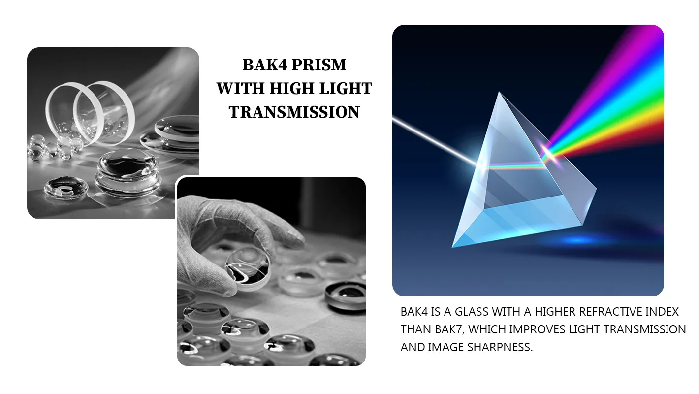 1. BAK4 prism with high transmittance, BAK4 is a refractive index higher than BAK7 glass can effectively improve the transmittance, clear image;